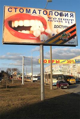 Все рекламные конструкции 3 на 6 метров в автограде исполком обязал 'перевязать' большими георгиевскими ленточками. Однако при этом никто не подумал, как это будет увязано с содержанием рекламы на щитах и их размерами. В итоге символика Победы перекрыла самую важную информацию – телефоны, адреса рекламодателей, нередко и логотипы компаний.