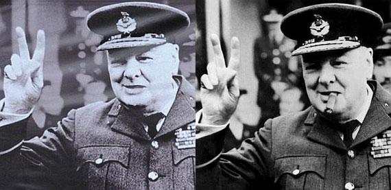 Со знаменитого снимка, на котором британский премьер Уинстон Черчилль показывает знак «V» (victory— победа), исчезла важная деталь. Неизвестный ретушер «убрал» сигару изо рта легендарного британского политика. Примечательно, что отредактированный снимок украшает фасад лондонского музея, посвященного военной истории страны