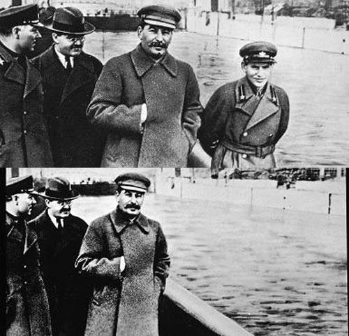 Во времена Иосифа Сталина ретушь фото применялась в СССР как никогда широко. Еще один пример— «исчезновение» с одного из снимков Николая Ежова. Нарком внутренних дел был изображен на фото рядом с самим Сталиным, но «исчез» после того, как был расстрелян.