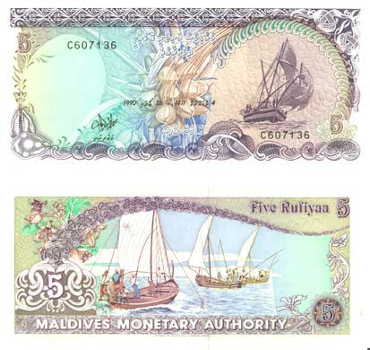 За доброй следует мальдивская руфия. Несмотря на то что её эквивалентная ценность невысока — Мальдивы являются очень небогатым государством, — бумажные деньги отнюдь не кажутся лубочными фантиками. Прежде всего это небольшие произведения искусства, где запечатлены прекраснейшие океанские виды, кокосовые пальмы, парусники и яхты и уникальнейшие раковины каури, которые в давние времена служили аборигенам средством товарного обмена. «Такие деньги — настоящая находка как для коллекционера, так и для искусствоведа, — отмечает Стендиш. — Впрочем, и простым туристам, за счёт которых сегодня фактически и живут Мальдивы, порой жалко расставаться с такими замечательными деньгами».