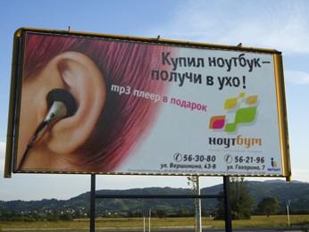 Первую провокационную рекламную акцию для томского «Ноутбума» разработала хорошо известная за Уралом рекламная группа «Мелехов и Фелюрин». Смысл безобидный: тем, кто купил ноутбук, раздавали наушники. По данным представителя интернет-магазина Ольги Серегиной, лучше всего реклама сработала в Красноярске, а также в Новосибирске, где после запуска акции продажи выросли вдвое. Представительства в этих городах были открыты незадолго до запуска акции. В родном Томске, где «Ноутбум» работала к тому моменту 15 лет, ей помешал имидж серьезной компании. «Газета может себе позволить написать «Вы у нас получите!», поскольку с ней нет личного контакта. В интернет-магазине есть контакт с продавцами-консультантами. И от такой рекламы может остаться «осадок», — считает Михаил Елагин из TWIGA.