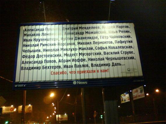В сообщении Трофимова-Трофимова речь идет о рекламной конструкции, на которой изображены фамилии лиц, 'приехавших в разное время в Санкт-Петербург-Ленинград и сделавших там карьеру'. В рекламе, призванной изменить негативное отношение жителей Петербурга к приезжим, перечислялись Александр Пушкин, Михаил Лермонтов, Модест Мусоргский, Илья Репин и многие другие известные личности.