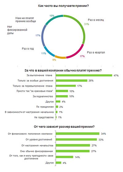 Опрос HeadHunter показал, что в среднем размер премиальных составляет 55% от зарплаты респондента. Около 50% респондентов получают премию в пределах 30–70% от зарплаты. По словам респондентов, премия зависит чаще всего от финансового положения компании (отметили 34%) и от уровня собственных достижений (33%).При этом 27% опрошенных признались, что размер поощрения за их труды зависит от настроения начальника. Такую же долю же респондентов вопрос о размере премии не волнует: они получают фиксированную премию, размер которой, по их мнению, ни от чего не зависит.