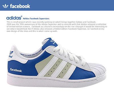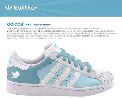 Дизайнер Джерри Маккей нанес на классические кроссовки Adidas Superstar логотипы Facebook и Twitter и раскрасил обувь в фирменные цвета соцсетей
