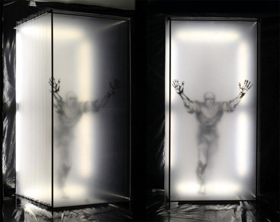 - Он собирается из листов бронированного стекла по 10 сантиметров каждый, - объясняет Марат Гельман. - Швы изолируются герметиком. Черной рамки, как на эскизе, не будет. Чистый кристалл. На каждом листе контур нанесен так, что в сумме получается объемная фигура, которая как бы прорывается сквозь дымку. Издали виден просто мощный кристалл, когда приближаешься - четко видна фигура. Параллелепипед подсвечивается.