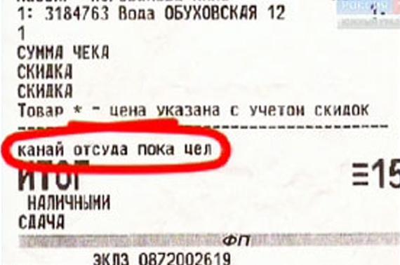 Двадцать пять челябинцев, совершив покупку в магазине сети Пятерочка, столкнулись с оригинальным видом привычного российского магазинного хамства. Покупателям как будто предписывалось больше не появляться в супермаркете. Они получили чек, на котором среди привычных цифр была такая надпись: Канай отсуда пока цел
