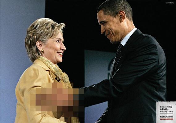 Агентство Memac Ogilvy & Mather Dubai для общественной организации «Репортеры без границ» разработало рекламную кампанию «Цензура рассказывает неправду» в виде принтов, на которых фотографии с известными политиками в определенных местах скрыты, что создает эффект двусмысленности: Обама держит за грудь Хиллари Клинтон, Гордон Браун, похоже, показывает с трибуны средний палец, а чем занимаются Саркози, Берлускони и Путин - даже не хочется и думать.