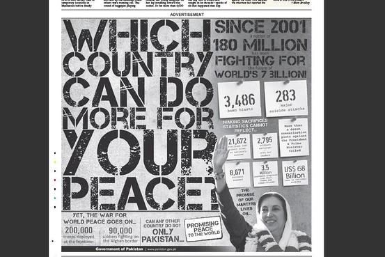 Нынешняя журнальная реклама стремится рассказать об этом широкой аудитории. А чтобы подчеркнуть свою проамериканскую настроенность, в рекламе даже появляется Беназир Бхутто, бывший премьер министр Пакистана, которая была убита исламскими боевиками в 2007 году. Кроме того, в рекламе содержится ссылка на статистику: почти 22 тысячи пакистанских мирных жителей погибли или были серьезно ранены в борьбе с терроризмом. Армия потеряла почти 3 тысячи солдат и более 3,5 млн человек стали беженцами в результате боевых действий. Ущерб, нанесенный экономике, оценивается в 68 миллиардов долларов.