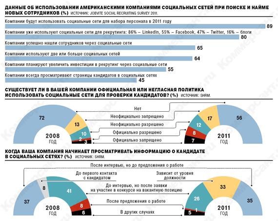 Популярность социальных сетей при найме кандидатов на работу в России также быстро растет, говорит партнер кадрового агентства TopContact Артур Шамилов. Там рекрутинговые агентства находят 5-10% всех потенциальных кандидатов, с которыми проводятся собеседования. В среднем на 15 подписанных контрактов с сотрудниками приходится один контракт с менеджером, которого нашли через социальную сеть, оценивает господин Шамилов. Но уже в следующем году количество кандидатов из сети может увеличиться в несколько раз, прогнозирует он.