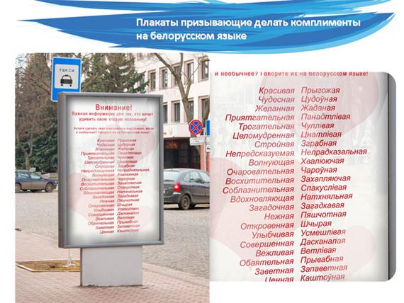 Жителям города предлагается удивляться неповторимостью белорусского языка, проходя мимо рекламных щитов, где изображены предметы, подписанные на родном языке, учиться говорить комплименты.