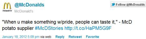 McDonald’s запустил рекламные твиты на прошлой неделе. Изначально к кампании был привязан хэштег #MeetTheFarmers, обозначающий гарантию свежей продукции, он сопровождался ссылками на рассказы фермеров-поставщиков фастфуда. Однако в прошлую среду компания сменила рекламный хэштег на более общий #McDstories.