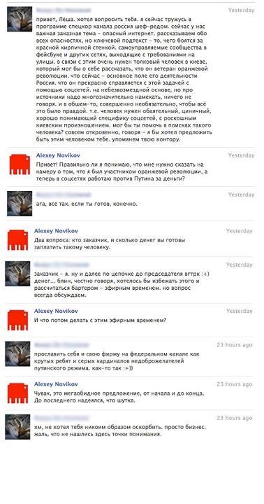 Креативный директор Escape Digital Marketing Group (Киев) Алексей Новиков опубликовал свою переписку в Facebook с человеком, представившимся шеф-редактором программы «Специальный корреспондент» на канале Россия 1.