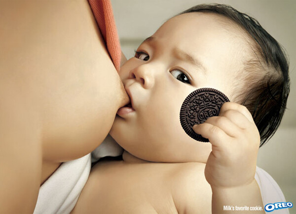 На постере младенец, которого кормит мать, держит в руке шоколадное печенье, которое, как правило, принято запивать молоком. Постер украшает традиционный слоган Oreo: 'Любимое печенье молока' (Milk's Favorite Cookie).