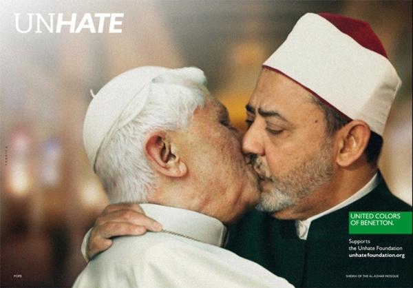Рекламная акция UNHATE корпорации Benetton, известной своей спонсорской деятельностью, провокациями и стремлением сочетать бизнес и культуру, была запущена в ноябре минувшего года. Вскоре после появления билбордов с «шокирующим» содержанием Benetton был вынужден снять рекламу из-за резкой критики со стороны Ватикана. В компании тогда заявляли, что акция направлена на преодоление ненависти в высших кругах, среди политических лидеров мира «ради победы добра».