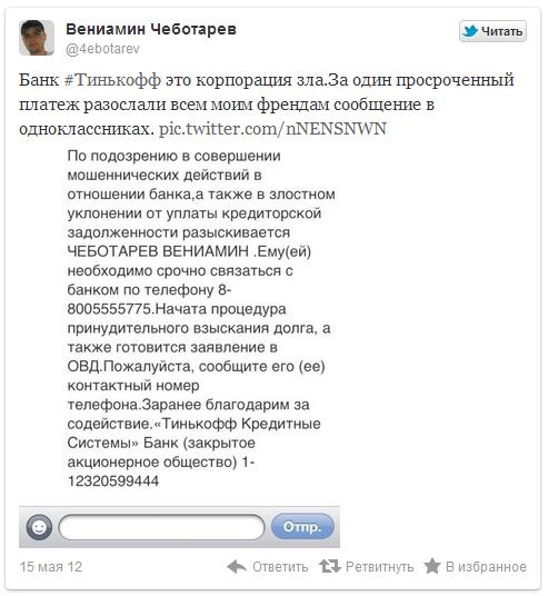 Сообщение об «инновационных» методах работы коллекторской службы банка «Тинькофф» опубликовал в своем Twitter один из клиентов этого банка: