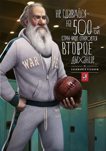 На постерах Пушкин в красном спортивном костюме с эмблемой дуэльных пистолетов и со свистком во рту призывает молодежь: 'Начинать с небольших текстов, постепенно увеличивая нагрузку'. Чехов в синем костюме с эмблемой чайки и секундомером в руке обещает: 'Три подхода по семь страниц ежедневно, и результат будет заметен через неделю'. Лев Толстой в костюме с надписью War and Peace говорит: 'Не сдавайся, на 500-й странице откроется второе дыхание'.