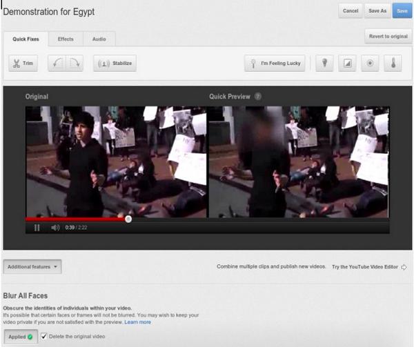 'Независимо от того, хотите ли вы поделиться секретными протестными видео без обнародования лиц протестующих активистов, или же поделиться видео, как вам 8-летний сын занимается спортом, наша технология размывки лиц - это первый шаг навстречу новому поколению анонимных видео на YouTube', - говорит Аманда Конвей, представитель YuoTube.