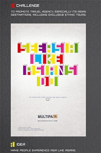 Рекламное агентство TABASCO разработало очень смешную и добрую, по их мнению, рекламную кампанию для туроператора MULTIPASS, призывающую украинцев ехать в Азию. На постере пестреют непонятные символы, а под ними подпись: To read the text screw up your eyes («Чтобы прочитать текст, прищурьтесь»). И действительно, разобрать написанное на плакате сможет лишь тот, кто «изобразит азиата», растянув пальцами глаза. Слоганом кампании стала фраза «See Asia like Asians do» («Увидеть Азию, как видят ее азиаты»). Его иллюстрирует еще однин плакат – масса людей с европейской внешностью, сужающих глаза.