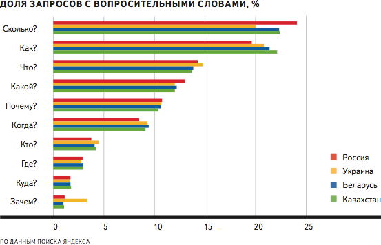 Из вопросительных слов пользователи чаще всего используют «сколько» и «как». Это неудивительно — слово «сколько» встречается в таких популярных вопросах, как количество серий в сериалах, возраст знаменитостей, стоимость товаров. Слово «как» обычно предваряет вопросы вроде «как узнать», «как пишется», «как лечить», «как проехать», «как удалить», «как отключить».