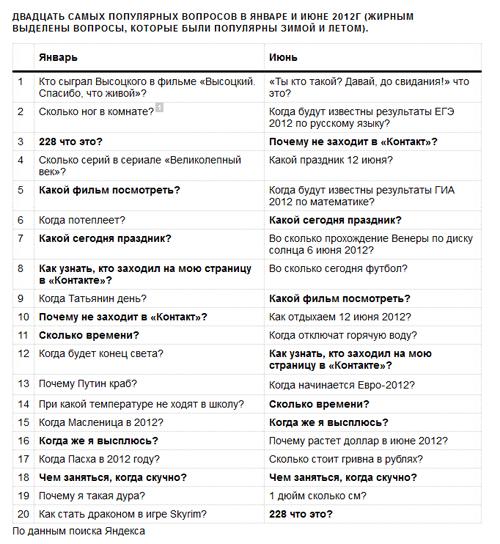 Чаще всего задают вопросы на актуальные темы: о свежих интернет‑мемах, новых фильмах и т.п. Возникнув в связи с определённым событием, запросы исчезают вскоре после того, как оно проходит. Так, например, в январе самые популярные вопросы были связаны с фильмом «Высоцкий. Спасибо, что живой» и сериалом «Великолепный век». А в июне — с популярным интернет‑мемом «Ты кто такой? Давай, до свидания!», результатами экзаменов (ЕГЭ и ГИА) и чемпионатом Европы по футболу.