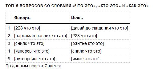 Довольно часто пользователи употребляют конструкции «что это», «кто это» и «как это» — с их помощью ищут определения новых слов, понятий и явлений. Нередко интерес к неизвестным понятиям обусловлен их широким употреблением в массовой культуре. Так, например, самый популярный зимний запрос с вопросительным словом «что» — [228 что это] — очевидно, вызван упоминаниями 228 статьи Уголовного кодекса во многих песнях российских рэп‑исполнителей и ростом популярности одежды с надписью «228». Также часто в топ неизвестных понятий попадают интернет‑мемы и интернет‑сленг.