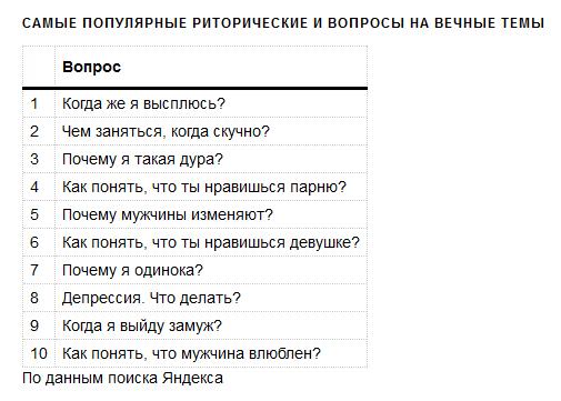 Чаще всего, задавая вопросы поиску, пользователи хотят решить определенные задачи, например, выяснить, какой фильм посмотреть, или узнать прогноз погоды. Но встречаются и риторические вопросы или вопросы на вечные темы — [когда же я высплюсь] и [почему я такая дура]. Среди них много вопросов про любовные отношения и, судя по формулировкам, любовные вопросы в значительно большей степени волнуют девушек.