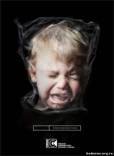 Если не вчитываться в текст под фотографией, то может создаться впечатление, что это реклама против жестокого обращения с детьми. На самом деле, таким образом, организация CONAC решила напомнить курильщикам, что они причиняют вред не только себе, но и окружающим. Слоган звучит так: «Курение это не только самоубийство. Это еще и убийство!» Действительно, если бы курильщикам вместо кашляющих и задыхающихся от табачного дыма соседей, мерещились подобные картины, возможно, их количество резко бы сократилось.