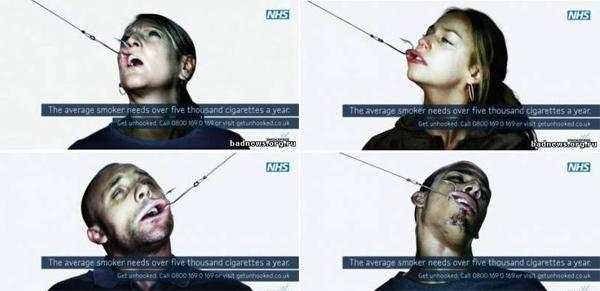 Шоковая реклама в действии: «Сорвись с крючка». В буквальном смысле. Это так NHS smokefree призывает бросить курить. И подсчитывает – «Среднему курильщику требуется пять тысяч сигарет в год». Пугающая статистика, да и картинка не из самых приятных.