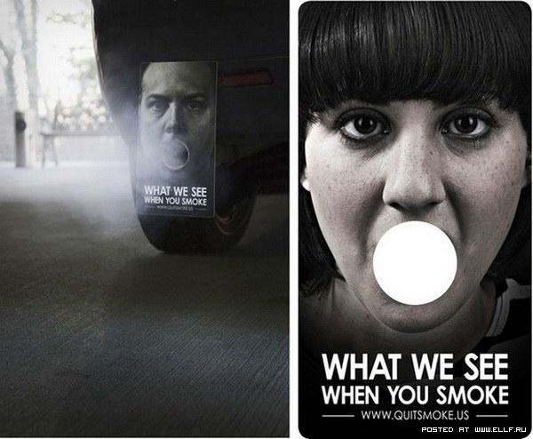 «Вот что мы видим, когда вы курите». Ну, в общем-то так оно и есть. Точно такую же рекламу еще размещали на уличных пепельницах, об которые тушили сигареты.
