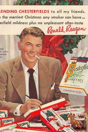 Вы узнаете этого мужчину? Пусть здесь он не очень похож на себя, но это будущий президент Рональд Рейган. Конечно, заняв свой высокопоставленный пост, Рейган старался не вспоминать об этой рекламной компании. А вот Chesterfield, наверняка выиграли на ней немало денег. Вы только представьте эти рекламные заголовки: «Наши сигареты курит сам президент Америки!».