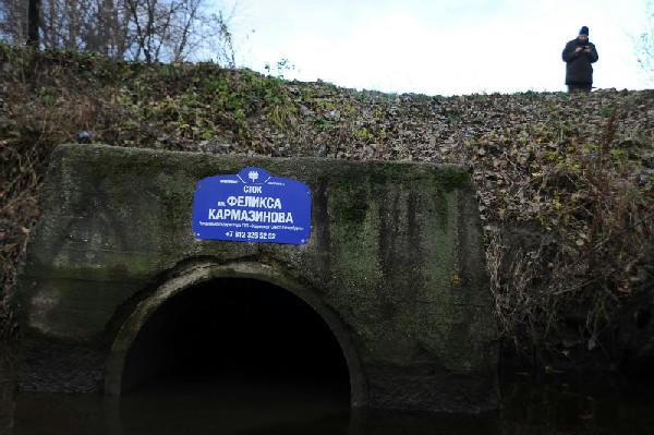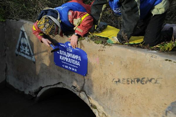 Активисты международной экологической организации Greenpeace присвоили сточным трубам Петербурга имена местных чиновников. В частности, были установлены таблички с фамилиями главы ГУП Водоканал Феликса Кармазинова, руководителя управления Роспотребнадзора по Петербургу Игоря Ракитина, руководителя Росприроднадзора Владимира Кириллова