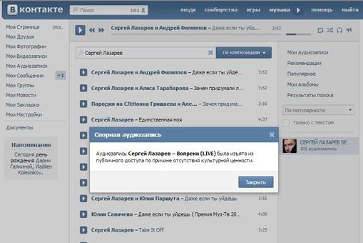 Записи Лазарева обнаруживаются поиском сервиса, одна при попытке воспроизвести трек появляется сообщение: «Аудиозапись Сергей Лазарев — (название песни исполнителя. — «Газета.Ru») была изъята из публичного доступа по причине отсутствия культурной ценности».