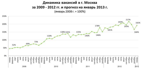 Согласно прогнозу Службы Исследований HeadHunter, в январе 2013 года ожидается увеличение количества вакансий на московском рынке труда на 92% по сравнению с январем 2008 года и на 8% в годовом исчислении (январь 2013 г. по сравнению с январем 2012 г.)