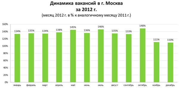 В среднем же в 2012 году на рынке труда Москвы наблюдался умеренный ежемесячный прирост вакансий в пределах 5-10% по сравнению с январем 2012 г.