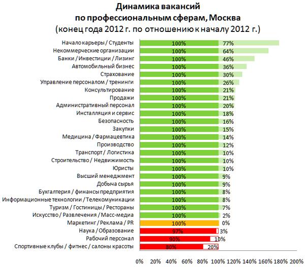 Наибольшая динамика прироста вакансий в конце 2012 года по сравнению с началом 2012 года была отмечена у специалистов сферы «Начало карьеры/студенты», «Некоммерческие организации», «Банки/Инвестиции/Лизинг», «Автомобильный бизнес», «Страхование». за тот же период времени было отмечено падение количества вакансий в сфере «Наука/образование», «Рабочий персонал», «Спортивные клубы/фитнес/салоны красоты».