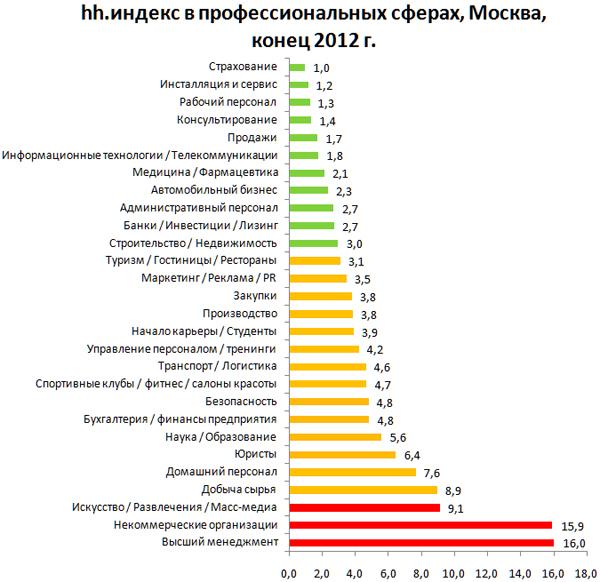 В конце 2012 года в «зеленую зону» индекса попали 11 проф. сфер из 28. (В эту зону попадают проф. области, где на одну вакансию претендуют не более трех кандидатов, что характерно для стабильной ситуации на рынке труда).