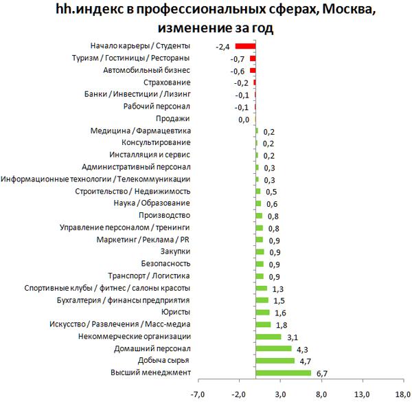 Снижение конкуренции среди соискателей отмечается в сферах «Начало карьеры/студенты», «Туризм/гостиницы/рестораны», «Автомобильный бизнес», «Страхование», «Банки/инвестиции/лизинг» и «Рабочий персонал».