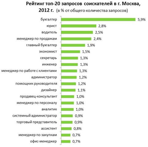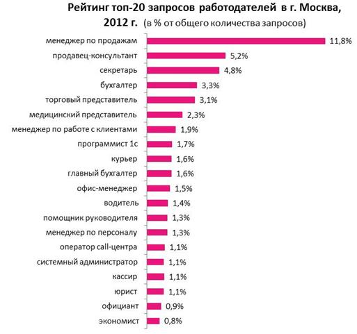 Рейтинг наиболее востребованных работодателями позиций в 2012 году возглавляли менеджеры по продажам (11,8% от общего количества запросов), продавцы-консультанты (5,2%) и секретари (4,8%). В целом на топ-20 запросов пришлась половина от общего количества запросов.