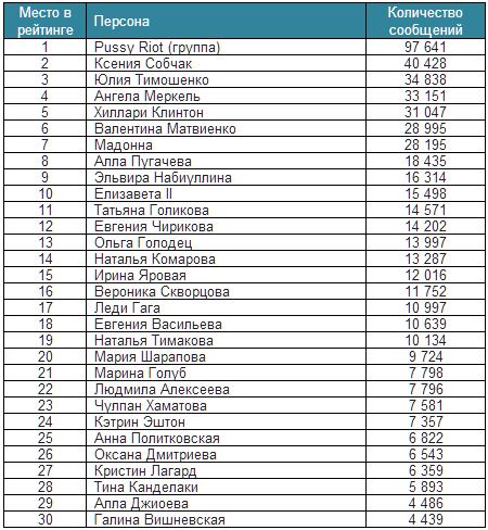 Лидерами медиа-рейтинга стали группа Pussy Riot, Ксения Собчак и Юлия Тимошенко.
