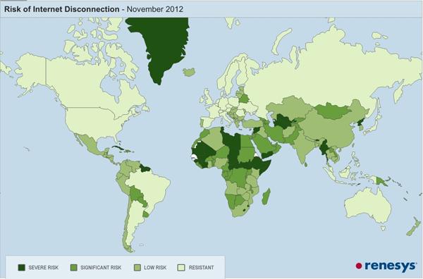 В списке самых уязвимых — 61 страна, среди которых Сирия, Тунис, Алжир, Туркменистан, Ливия, Эфиопия, Узбекистан, Мьянма и Йемен. Россия же, по мнению Renesys, почти настолько же защищена от полного обрыва связи во всей стране, насколько США, Канада, Австралия и большинство стран Евросоюза.