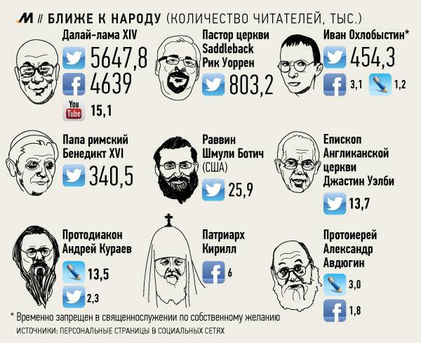 Большинство религиозных лидеров используют аккаунты в соцсетях в качестве вывески, избегая непосредственного общения онлайн. Официальный аккаунт патриарха Кирилла в Facebook появился в мае 2012 года, но впервые он ответил на комментарии только на прошлой неделе. Twitter-аккаунт лидера дзен-буддизма Тхить Нят Ханяна ведут представители монастырской общины. Папа Бенедикт XVI также вряд ли будет сам писать твиты и делегирует это помощникам.