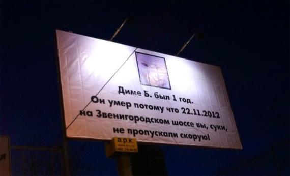 «Диме Б. был 1 год. Он умер потому что 22.11.2012 на Звенигородском шоссе вы, суки, не пропускали скорую», - гласит надпись на щите. Фотографию баннера в своем блоге разместил журналист Рустем Адагамов.