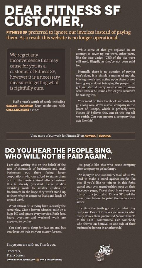 Мы сожалеем о неудобствах, которые этот факт может доставить вам, как клиентам Fitness SF, однако это необходимая мера для того, чтобы попытаться получить то, что принадлежит нам по праву. Часть нашей работы не была оплачена.