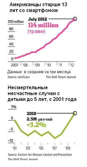 Американские СМИ обратили внимание, что за последние 5 лет - начиная с момента появления iPhone - резко возрасло число несчастных случаев с детьми до 5 лет. Несчастные случаи у взрослых возрасли ещё резче. Исследователи связывают это явление с девайсами - вместо того, чтобы следить за маленьким ребёнком, взрослые пишут SMSки, читают почту, смотрят фотки,...