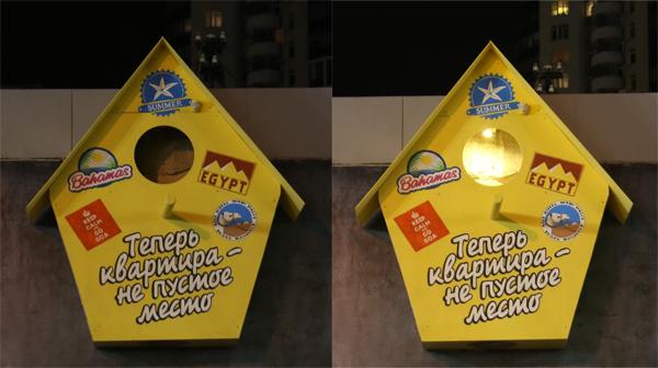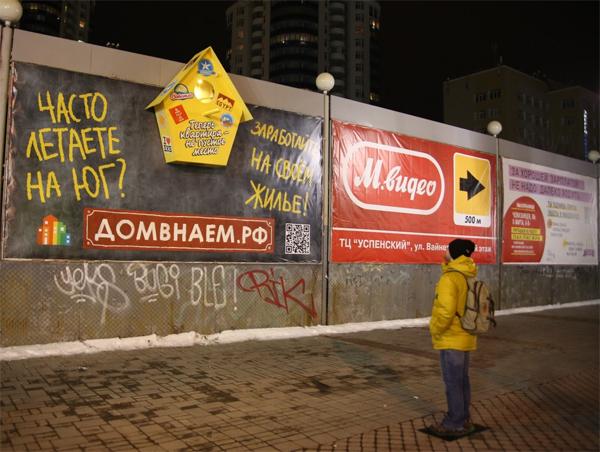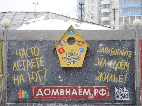 Сегодня на одной из главных пешеходных улиц Екатеринбурга, прямо на рекламной конструкции появился гигантский скворечник, в котором легко мог бы поселиться хоть кудрявый пеликан, хоть птеродактиль. Благодаря стараниям уличных художников, он превратился в настоящий арт-объект, главной фишкой которого стал эффект, производимый вмонтированным датчиком движения. Когда человек подходит к конкретной точке, отмеченной в виде коврика с изображением улыбки - внутри скворечника загорается свет. Именно в этот момент центральное сообщение «Теперь квартира - не пустое место» получает новый смысл.