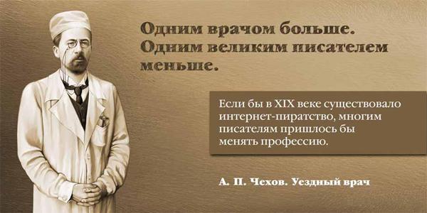 Например, Антон Павлович Чехов представлен в костюме врача. Как известно, он на самом деле когда-то трудился уездным доктором. А его портрет сопровождает текст: «Одним врачом больше, одним великим писателем меньше».