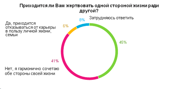В то же время 50% опрошенных признают, что их жизнь далеко не так гармонична: 41% уверяют, что работа съедает время на семью, встречи с друзьями и любимые занятия, еще 6% в угоду личной жизни отказались от карьеры и хорошей работы.