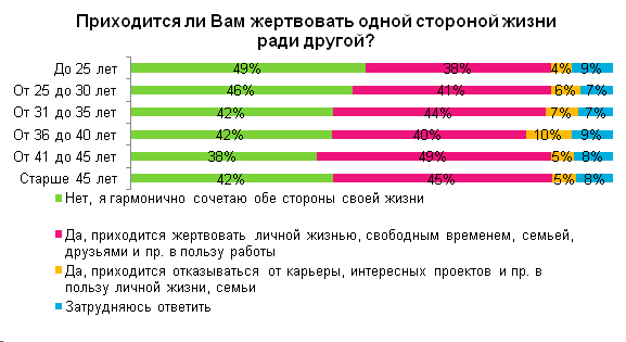 Почти половина опрошенных работников (45%) указали, что их образ жизни предполагает гармонию между рабочим и личным временем. Они сумели организовать свое рабочее время таким образом, чтобы оно никак не отражалось на радостях личной жизни, а семья, хобби и отдых позволяли бы в полной мере реализовать себя на трудовом поприще.