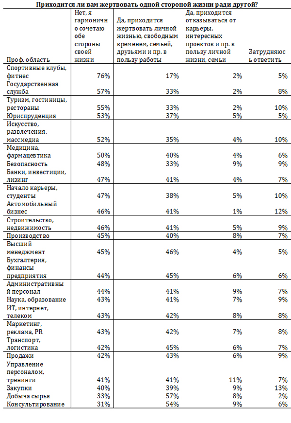 Выяснилось, что каждый второй не может добиться гармонии в личной жизни и работе. Причем наиболее часто страдает как раз внерабочая сторона жизни — семья, дети, досуг, здоровье и пр. Особенно остро дисбаланс в личной и рабочей жизни ощущают представители сферы добычи сырья, фактически каждый второй работник этой отрасли сталкивается с подобными проблемами. Напротив, самая гармоничная в данном отношении профессиональная область — спорт и фитнес.