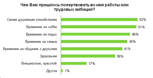 Работа настолько сильно вклинивается в личную жизнь работников, что не позволяет им расслабиться даже по выходным! 52% опрошенных указали, что пожертвовали душевным спокойствием в угоду работе, 51% — временем на хобби, 46% — отдыхом, 45% — семьей и детьми, 41% — общением с друзьями, 36% — здоровьем и 17% — внешним видом!